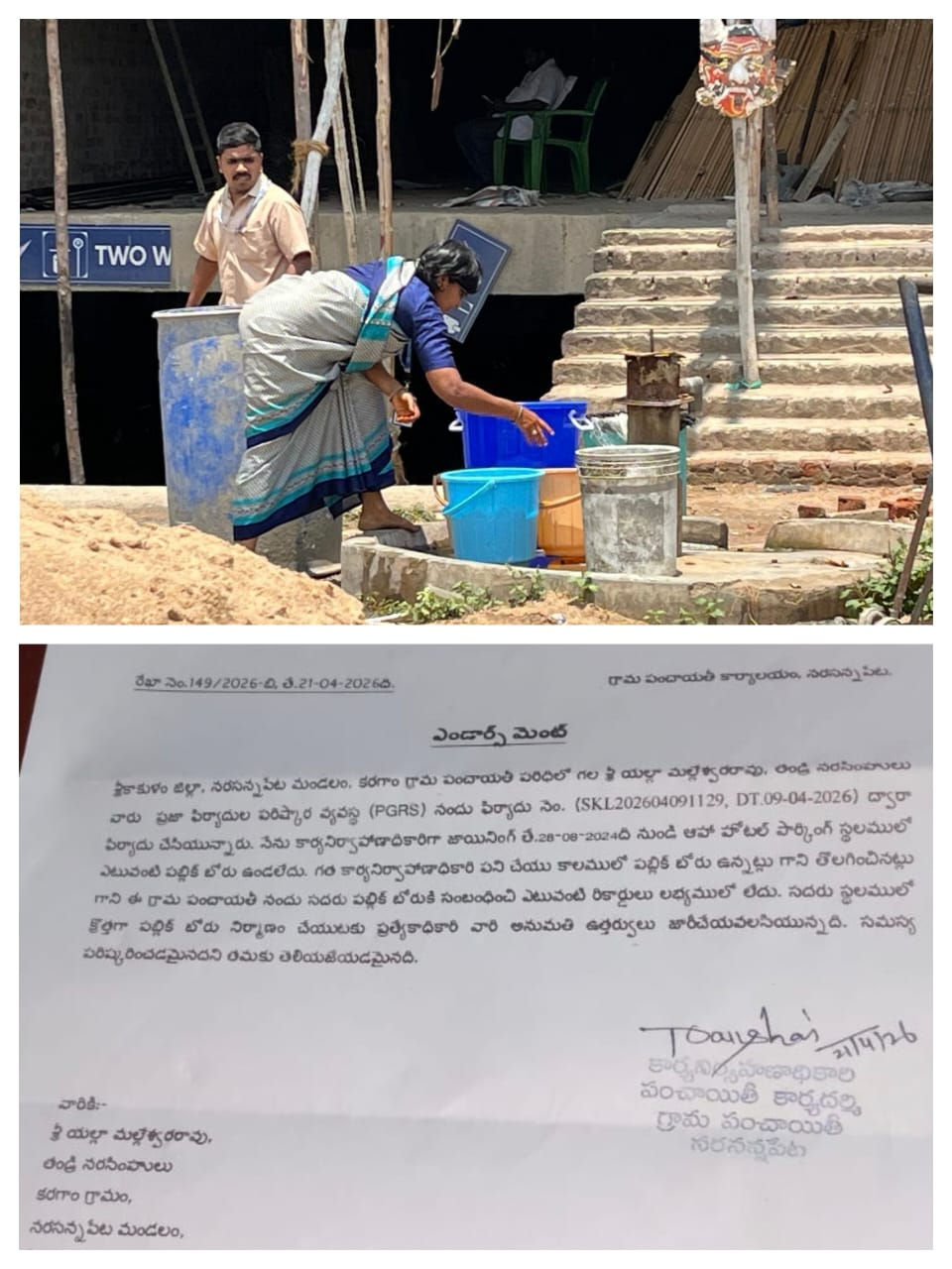 ప్రభుత్వ స్థలంలో ఉన్న పబ్లిక్ బోర్ను ఎందుకు తొలగించారని స్థానికులు, ఆటోడ్రైవర్లు హోటల్ యాజమాన్యాన్ని ప్రశ్నిస్తే.. తమ స్థలంలో బోరు ఉందని, అందుకే తొలగించామని చెబుతున్నారట. ప్రైవేటు స్థలంలో బోరు ఉండటమేమిటని మరికొందరు ప్రశ్నిస్తున్నారు. కాదు కాదు అది కాలువ గట్టు అని కొందరంటున్నారు. దీనిపై మÖడు పర్యాయాలు గ్రీవెన్స్లో ఫిర్యాదు చేసినట్టు యాళ్ల మహేష్ ‘సత్యం’కు తెలిపాడు. ఏడాది క్రితం నుంచి బోరు తొలగించిన వారిపై చర్యలు తీసుకొని నూతనంగా బోర్ను ఏర్పాటు చేయాలని స్థానిక పంచాయతీ ఈవోను కోరినా ఫలితం కలినిపించలేదని తెలిపాడు. ఇటీవల మరోమారు గ్రీవెన్స్లో ఇచ్చిన ఫిర్యాదుపై ఉన్నతాధికారులు స్పందించి చర్యలు తీసుకోవాలని ఈవోను ఆదేశించారని తెలిపాడు. ఉన్నతాధికారుల ఆదేశాల మేరకు ఈ నెల 21న అక్కడ బోరు లేదని, పబ్లిక్ బోరు ఉన్నట్టు పంచాయతీ రికార్డుల్లో నమోదు కాలేదని పంచాయతీ సెక్రటరీ ఒక ఎండార్స్మెంట్ను ఇచ్చారు. ప్రభుత్వ స్థలంలో పంచాయతీకి చెందిన పబ్లిక్ బోర్ను 2024 నవంబర్లో ప్రైవేట్ వ్యక్తులు తొలగించినట్టు స్థానికులు చెబుతున్నారు. నరసన్నపేటలో ప్రధాన రోడ్డును విస్తరించినా పబ్లిక్ బోర్ అవసరాన్ని గుర్తించి దానికి ఎటువంటి నష్టం కలగనివ్వకుండా కాపాడుకున్నామని, అలాగే 2017లో రోడ్డు పక్కనే వైఎస్సార్ విహ్రాన్ని ఏర్పాటు చేసినప్ప్పుడూ బోర్ను తొలగించే ప్రయత్నం చేయలేదని ఆటో డ్రైవర్లు చెబుతున్నారు. ఆహా హోటల్ నిర్మించాకే పార్కింగ్ కోసం పబ్లిక్ బోర్ను లేపేశారని ఆవేదన వ్యక్తం చేస్తున్నారు. ఈ భవనం మాత్రం వేరేవారిది. హోటల్ నడుపుతున్నది మరొకరు. అడ్రస్ కోసం మనం ఆహా హోటల్ అనే చెప్ప్పుకోవాలి.